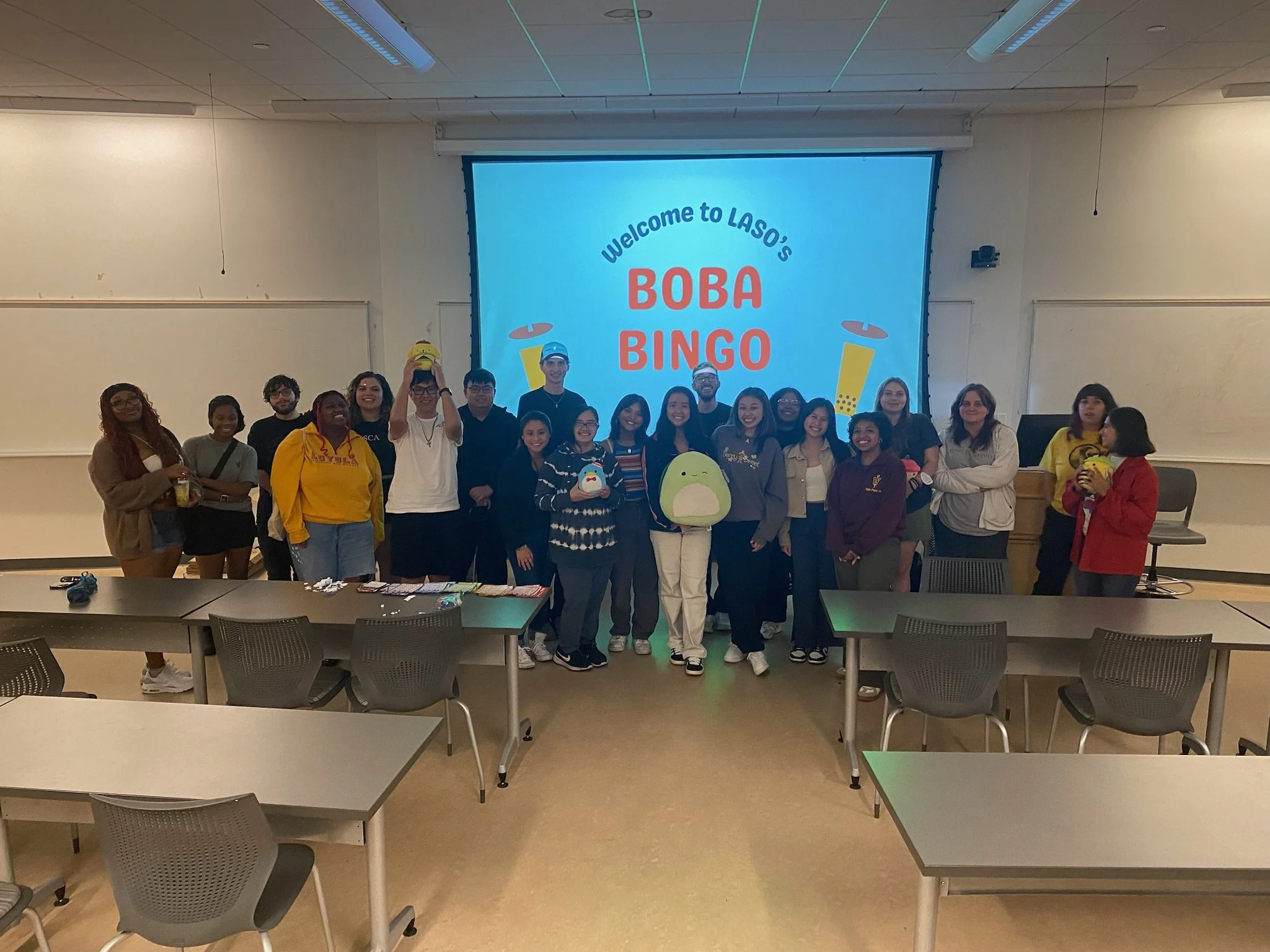 Boba BINGO is always a great event to begin each semester! It introduces new students to our organization and allows new and old members to meet each other. As students begin arriving, LASO provides an assortment of Asian snacks like pocky and guava candy for attendees to enjoy while they socialize. LASO E-Board begins with an interactive icebreaker to get everyone more comfortable with each other. During this event, we gave the attendees 3 minutes to line up in the front of the room in chronological order of their birthday (without talking). They were allowed to use hand gestures and any creative form of communication. After the icebreaker, LASO E-Board gave a short presentation introducing each board member, briefly discussing LASO's mission, showing our past events (and asking what events students would like to attend this year), reviewing membership perks/dues, and outlining the number/types of BINGO games that will be played. Boba BINGO took place on February 6, 2025. We had an attendance of 26 people! All attendees were welcome to any snacks and drinks, but winners would have the chance to chose a prize (a squishmallow or boba drink from Sharetea). We hosting a variety a games consisting of five-in-a-row, four corners, and black out. Throughout the event, students would get more and more competitive with each other. LASO's graphic designer, Maxine Olson, designed an amazing graphic to advertise our first event of the year! We printed flyers and posted it all around campus and posted on our social media to encourage students and other VSA students to join us!