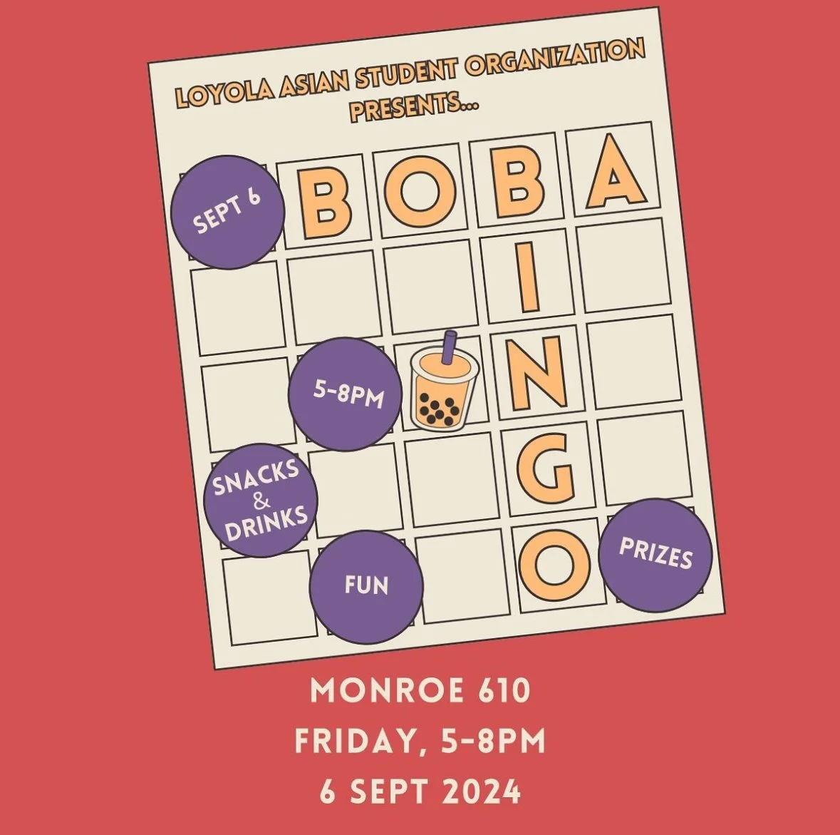 Boba BINGO is LASO's most successful events that is held at least once every semester! The information regarding the title, time, date, time, and location of the event is designed as a bingo card. The title of the event, "Boba BINGO" is displayed across the BINGO card in a unique fashion that attracts the attention of many!