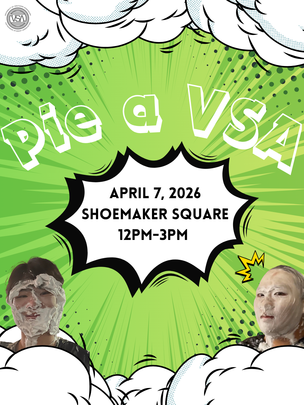 The population was aimed for anyone around the USM campus, along with individuals from other VSAs in the Gulf Coast region. We wanted to allow everyone a chance to have fun on the college campus while putting in the efforts towards a good cause. As for the background information for the event, It took place on April 7th, 2026, from 12 pm to 3 pm. It was located on USM campus at Shoemaker Square. The purpose of "Pie a VSA" was to have an event on USM campus where anybody can have fun pie-ing us while also explaining how the funds are going to a philanthropic cause. With the money we raised, it gets put back into the organization to help build the foundation of the club while also going to our Collective Philanthropy Project for that year. When looking at pre-orders and day-of purchases, we had around 40 participants, with 100 pies total. This included those on campus, family, and friends who wanted to participate. As for resources, these included purchases for the whipped cream. After consulting with our Treasurer, we were able to make the necessary purchases. Mainly for everything else, we already had in our organization inventory to use. As for marketing, of course, we used our social media platform. Our Public Relations Chair and President collaborated on a graphic to post, introducing the event with relevant information regarding it (such as when, where, pricing, etc.). Alongside this, to gather more engagement, we created a video to post as well. This included the E-Board and Interns to make a funny and entertaining videos marketing the event. We also relied on personal communication to spread it. E-Board and Interns had friends and family who wanted to take part in pie-ing them, which helped drastically in the success of the occasion. In the end, the amount raised from "Pie a VSA" was $257, which was very successful.